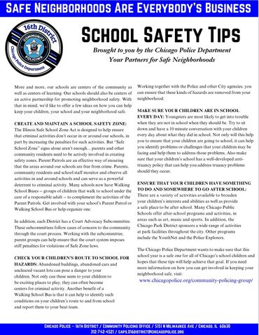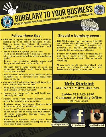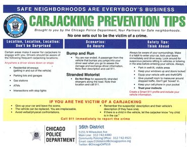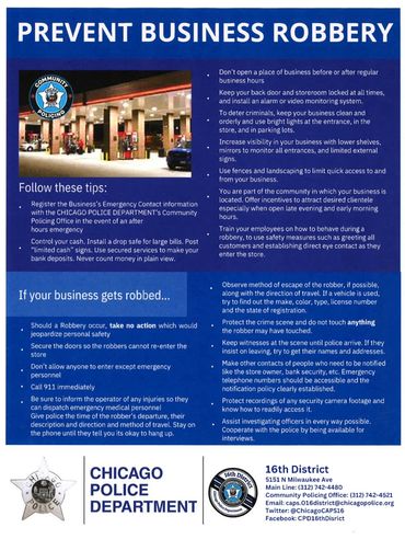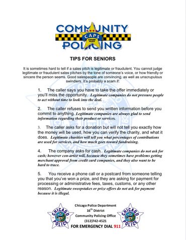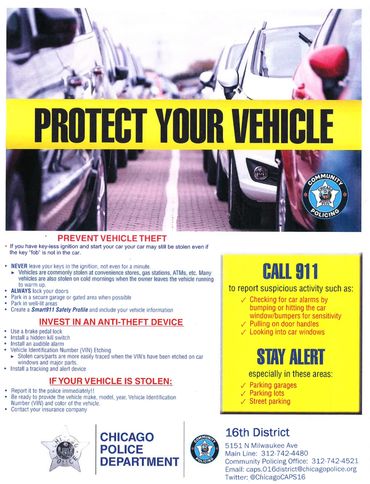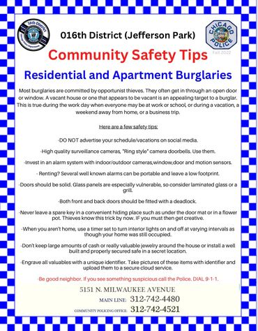 The Chicago Police Department is always reaching out to the community to share information about how to remain safe. Here are some recent tips provided by the Department. Please remember in an emergency, dial 9-1-1. For more information, contact the Chicago Alternative Policing Strategy (CAPS) office at 312-742-4521 or caps.016district@chicagopolice.org.